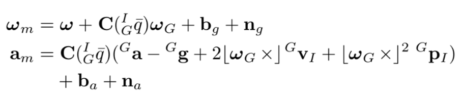 $\mathbf{C}(\cdot)$는 rotation matrix, $\mathbf{n}{g}, \mathbf{n}{a}$는 zero-mean white Gaussian noise이다.