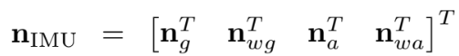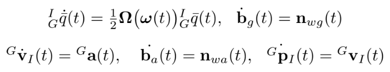 IMU bias는 random walk process이며 white Gaussian noise vector $\mathbf{n}{wg}$와 $\textbf{n}{wa}$로부터 이끌어 낼 수 있다.
