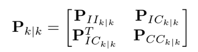 $\mathbf{P}{I C{k \mid k}}$는 IMU state error와 camera pose 추정 간의 correlation