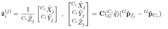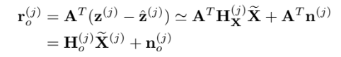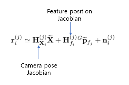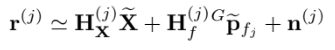 $\mathbf{H}{\mathbf{X}{i}}^{(j)} ,\mathbf{H}{f{i}}^{(j)}$는 measurement Jacobian임
