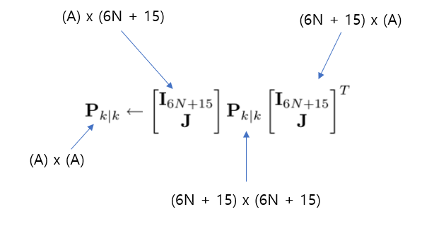 $\mathbf{P}{C C{k \mid k}}$는 camera pose 추정의 covariance matrix이고 6N x 6N 이다.
