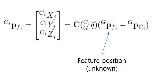 근데 state 추정 $\textbf{X}$는 feature position 추정하는데 ${ }^{G} \widetilde{\mathbf{p}}{f{j}}$ 는 $\tilde{\textbf{X}}$ 와 correlated함 따라서