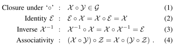 Group은 집합 $\mathcal{G}$와 연산 $\circ$ 이 집합 원소 $\mathcal{X}, \mathcal{Y}, \mathcal{Z} \in \mathcal{G}$에 대해 다음 4가지 조건을 만족 시킨다.