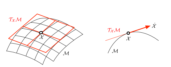특정 위치 $\mathcal{X}$에서의 속도는 $\dot{\mathcal{X}}=\partial \mathcal{X} / \partial t$이며, 이는 $\mathcal{M}$위의 점 $\mathcal{X}$의 tangent space에 속해 있다 .