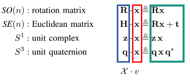 $SO(n)$은 회전 행렬만 모아 놓은 군, $SE(n)$은 회전과 이동을 모아 놓은 군, $S^1$은 2D 복소공간, $S^3$은 쿼터니언 공간이다.
