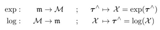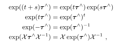 $\exp \left(\boldsymbol{\tau}^{\wedge}\right)=\mathcal{E}+\boldsymbol{\tau}^{\wedge}+\frac{1}{2} \boldsymbol{\tau}^{\wedge 2}+\frac{1}{3 !} \boldsymbol{\tau}^{\wedge 3}+\cdots$